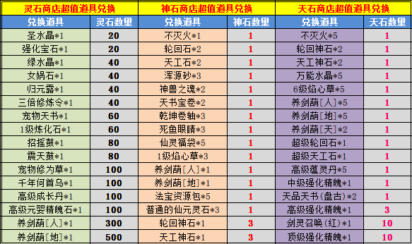 金额≥3000 100% 高级强化精魄*1、高级蕴灵丹*10、顶级升灵丹*15、轮回神石*5、天工神石*5、不灭火*15、万能水晶*10、5级焰心草*10、剑魂*99990