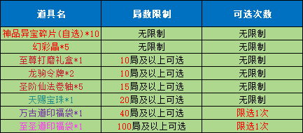 稀有道具:高级升灵丹*1、6级炼化石*1、超级轮回石*1、成长粉尘礼盒*1、兽神丹*1、神锋石*1