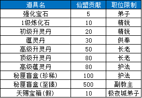 仙盟贡献:仙盟贡献可提升仙盟技能以及在仙盟商店中兑换道具;